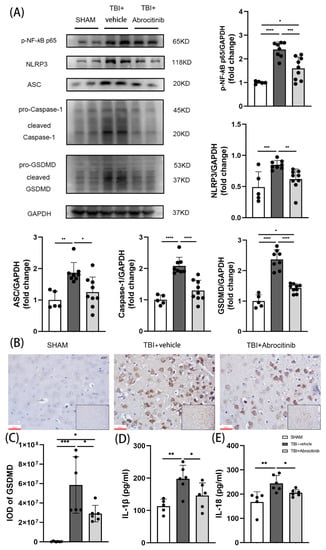 NF-κB is still recognized as a predominant transcription factor in the regulation of pro-inflammatory mediators after TBI []. TBI increases the levels of pro-inflammatory factors in brain tissue, some of which, such as IL-1β and IL-18, are important in the process of pyroptosis. Moreover, the NF-κB-related signaling pathway was determined to investigate the role of the inflammatory response and pyroptosis after TBI. The WB results revealed that following TBI, the content of p-NF-κB evidently increased, as did the levels of NLRP3, ASC, caspase-1, and GSDMD, which are the downstream factors of NF-κB (Figure 6A). In addition, the contents of IL-1β and IL-18 were drastically increased after TBI (Figure 6D,E). All factors not only led to an excessive inflammatory response, but also exacerbated pyroptosis, which was investigated using GSDMD IHC staining (Figure 6B,C). Conversely, abrocitinib treatment significantly reduced the levels of NF-κB and its downstream factors. Therefore, the pyroptosis induced by those factors lessened, which was verified by WB results and GSDMD IHC staining (Figure 6).