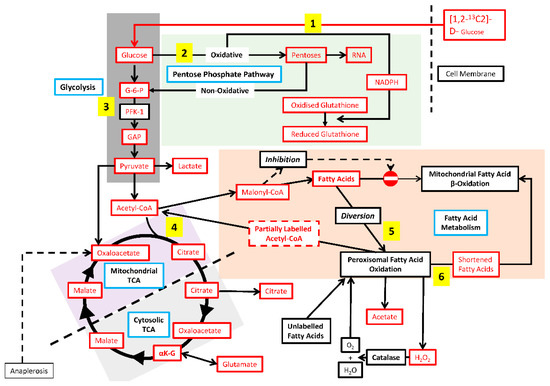 Figure 1. Diagram of metabolic pathways and relevant control mechanisms. 1—Glucose consumption, 2—Pentose phosphate pathway, 3—Rate-limiting step in glycolysis, 4—AcetylCoA to malonylCoA flux (de novo fatty acid synthesis), 5—Fatty acid diversion into peroxisomal fatty acid oxidation, 6—Shortened fatty acids enter mitochondria for further β-oxidation, 7—Citrate shuttle.