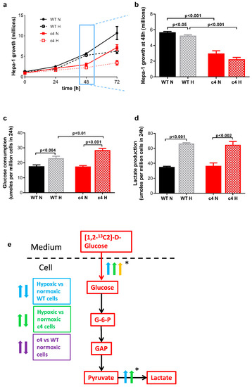 Figure 2. Cell growth, glucose consumption, and lactate output under normoxia and hypoxia in Hepa-1 WT and c4 cells. (a) Hepa-WT and Hepa-c4 growth profiles in normoxia and hypoxia (n = 3). (b) Cell numbers at 48 h showed delayed growth in Hepa-c4 cells (n = 3). (c) Glucose consumption at 48 h was elevated more by hypoxia in Hepa-c4 cells than in WT cells (n = 7). (d) Lactate production at 48 h was equally elevated by hypoxia in Hepa-c4 cells and WT cells (n = 5). (e) Diagram showing flux differences and changes between the two Hepa-1 cell types in normoxia and hypoxia. N, normoxia; H, hypoxia (1% O2); arrows pointing upwards suggest significant increase for a given comparison. * Indicates differences in metabolic flux (↑ increased flux; decreased flux) due to HIF deficiency and hypoxia, which were inferred from concentration changes in the substances indicated. Panels (ad) show data expressed as mean ± SEM; statistical significance assessed by unpaired two-tailed t-test.