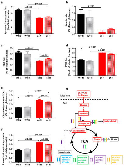 There was significantly more shuttling (instead of cycling) of citrate (Figure 3e) out of the TCA in Hepa-c4 compared to Hepa-WT cells, both in normoxia and hypoxia (p < 0.001). However, the citrate shuttle rate was slightly but significantly (p < 0.03) lower in hypoxic than normoxic Hepa-c4 cells. This decreased flux of citrate molecules from the TCA in hypoxic vs. normoxic Hepa-c4 cells would contribute towards the unexpectedly higher TCA flux in hypoxic vs. normoxic Hepa-c4 cells previously mentioned (Figure 3c).