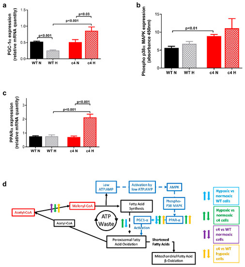 We also measured PPARα, the downstream target of PGC-1α, which controls peroxisomal fatty acid oxidation (PFAO) [38]. PPARα expression, assessed by real-time PCR (Figure 4c), was similar for Hepa-WT cells cultured in both conditions and in normoxic Hepa-c4 cells. However, in hypoxia, it increased almost three-fold in Hepa-c4 cells (p < 0.001 when compared to normoxic Hepa-c4 and to hypoxic Hepa-WT cells).