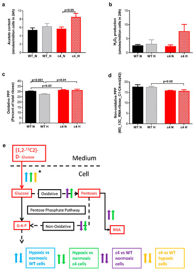 Figure 5. PFAO markers and differences in pentose phosphate pathway flux in Hepa-1 cells. (a) Acetate content significantly increased in Hepa-c4 cells in response to hypoxia (p < 0.05, n = 5). (b) Hypoxic Hepa-c4 cells released more hydrogen peroxide into the media (p < 0.05, n = 5) (c) Nucleic acid ribose synthesis via the oxidative pentose phosphate pathway was higher in Hepa-c4 than WT cells in both normoxia and hypoxia (p < 0.02 and p <0.01, respectively, n = 4). (d) Nucleic acid ribose re-assembly via the non-oxidative pentose phosphate pathway was slightly lower in Hepa-c4 than WT cells (p < 0.05), but was not substantially affected by hypoxia in either cell line. (e) Diagram showing flux differences and changes between the two Hepa-1 cell types in normoxia and hypoxia. N, normoxia; H, hypoxia (1% O2); arrows pointing upwards suggest significant increase for a given comparison. * Indicates differences in metabolic flux (↑ increased flux; decreased flux) due to HIF deficiency and hypoxia, which were inferred from changes in the relevant 13C-labelled isotopomers; *↑ and *↓ fluxes were inferred from concentration changes in the substances indicated, not their 13C-labelling. Panels (ae) show data expressed as mean ± SEM; statistical significance assessed by unpaired two-tailed t-test.
