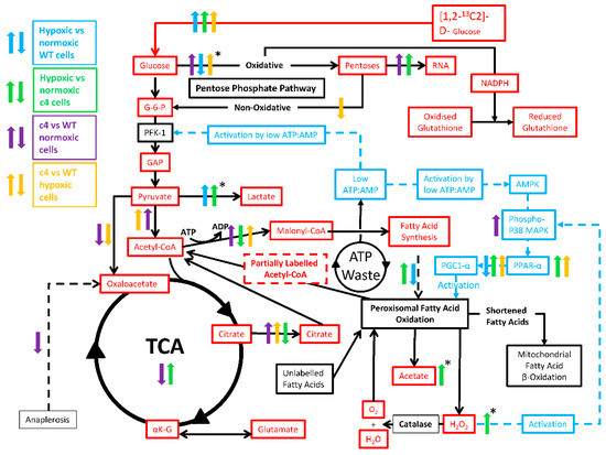 Figure 6. Metabolic fluxes and control factor expression changes in Hepa-1 cells. Solid black lines indicate metabolic pathways; dashed dark-blue lines indicate control mechanisms. Coloured up and down arrows indicate alterations in metabolic fluxes or changes in control factor expression compared with the corresponding parameter in WT or Hepa-c4 cells in normoxia: blue arrows, WT cells in hypoxia vs. normoxia; green arrows, Hepa-c4 cells in hypoxia vs. normoxia; purple arrows, Hepa-c4 cells vs. WT cells in normoxia; orange arrows, Hepa-c4 cells vs. WT cells in hypoxia. Differences in metabolic flux (↑ increased flux; decreased flux) due to HIF deficiency and hypoxia were inferred from changes in the relevant 13C-labelled isotopomers; *↑ and *↓ fluxes were inferred from concentration changes in the substances indicated, not their 13C-labelling. Arrows pointing upwards suggest significant increase for a given comparison.