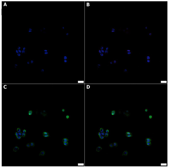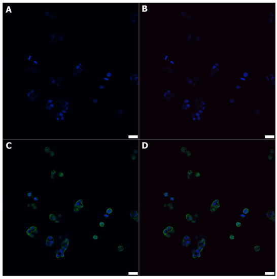 The immunofluorescence labeling against nuclei (blue DAPI), HIF1α (red), and β-actin (green) in normoxic HT-29 cells (A–D) showed no HIF1α-positive cells (B,D). All cells were positive on DAPI (A–D) and β-actin (C,D); scale bars = 20 μm.