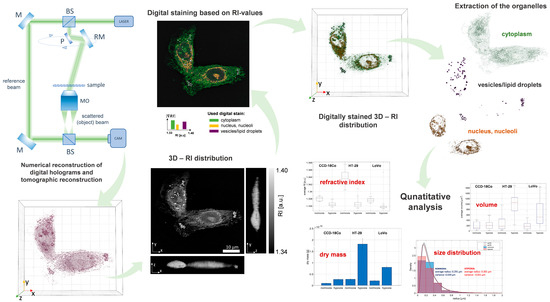 - Sandoz, P.A.; Tremblay, C.; Gisou van der Goot, F.; Frechin, M. Image-Based Analysis of Living Mammalian Cells Using Label-Free 3D Refractive Index Maps Reveals New Organelle Dynamics and Dry Mass Flux. PLoS Biol. 2019, 17, e3000553. [Google Scholar] [CrossRef]