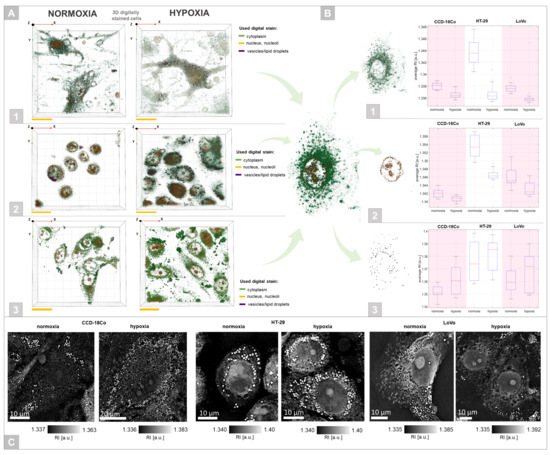 (A) The digitally stained 3D visualizations of CCD-18Co (1), HT-29 (2), and LoVo (3) cells under normoxic and hypoxic conditions (scale bars: 20 µm). (B) The boxplots representing the variation of the average RI values of cytoplasm (1), nucleus and nucleoli (2), and vesicular content (3) and their digitally stained representative visualizations. (C) The representative 2D-RI tomograms indicating the location of vesicles/lipid droplet-like structures inside the single-cells.