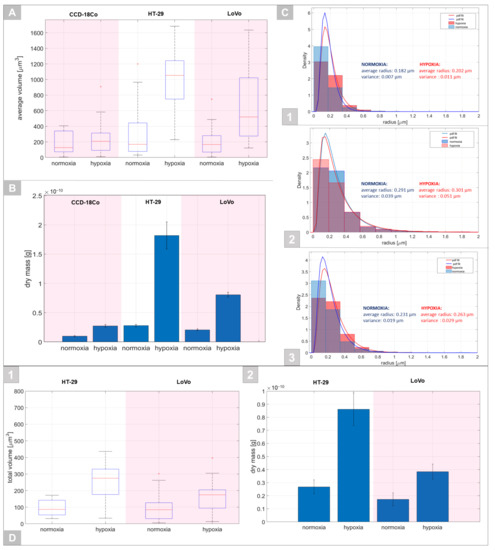 It was shown that for CCD-18Co cells, the average volume of these structures within the cells was not changing noticeably under hypoxia (Figure 6A). However, hypoxic cells of HT-29 and LoVo showed a significant increase in their average volume, which indicates that the concentration of these structures may be directly related to hypoxia. Furthermore, the determined dry mass of detected cellular objects was increased under hypoxic conditions (Figure 6B), suggesting that their cargo was denser. A comparison of the size distribution of these spheroid-shaped structures changed when the oxygen concentration decreased (Figure 6C). Generally, under hypoxia, the average radius of detected structures was increased and showed the highest values for cancer cells, particularly for HT-29 cells. In the case of the healthy colonic cells, under normoxia, a higher number of these structures had a radius below 185.7 nm, while under hypoxia, the examined objects showed higher values of the radius. In particular, the number of structures with radii from 185.7 nm to 371.4 and 371.4 nm to 557.1 nm was increased under hypoxia. A similar tendency was observed in the case of the LoVo cells. However, the number of structures with a radius in the range of 185.7 to 371.4 nm was lower and distributed in the range of 371.4–557.1 nm, which was higher than that in the case of CCD-18Co cells. The opposite tendency occurred in the case of HT-29 cells. These cells demonstrated that the highest fraction of detected structures had a radius value below 187.1 nm under hypoxia and between 187.1 and 371.4 nm under normoxia.