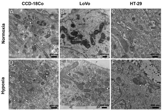 Micrographs of representative cells’ cytoplasm in normoxia (A–C) and hypoxia (D–F). (A,D) CCD-18Co cells in lower oxygenation tend to have more autophagic vacuoles (arrows) and multivesicular bodies (MVBs; dot marker), as well as more numerous Golgi apparatuses (short arrows). (B,E) Mitochondria in the LoVo cell line tend to be larger and fused (arrowhead), suggesting the dominance of fusion over the fission process. MVBs and autophagic vacuoles are less numerous than those in the CCD-18Co cell line. (C,F) Hypoxic mitochondria in HT-29 tend to be less electron-dense than the normoxic ones. No significant differences in autophagy or exocytosis were observed (n = 3 cells/each cell line).