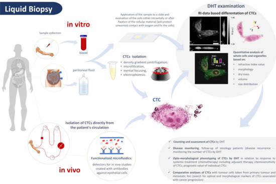 DHT enables the simultaneous assessment of the morphology of the tested cells and their optical parameters as well as immunofluorescence detection of selected markers, which is possible with the use of the latest devices available on the market. An advantage of DHT is the short analysis time and relatively low costs associated with the operation of the device—a specific financial outlay is required for the purchase of appropriate measuring equipment. The undoubted advantage of DHT is the possibility of performing additional analyses of single tumor cells that were previously examined on the glass slide using other DHT-supportive molecular techniques. Moreover, the specimens can be examined immediately after their collection at the patient’s bedside and do not require any special staining or additional isolation procedures. Verifying this hypothesis requires further research and multicenter randomized studies in this direction. The possibilities of the potential application of DHT in the detection and evaluation of CTCs are presented in Figure 9.