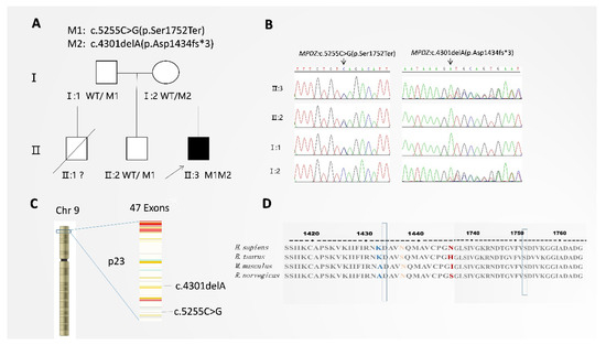 - Al-Dosari, M.S.; Al-Owain, M.; Tulbah, M.; Kurdi, W.; Adly, N.; Al-Hemidan, A.; Masoodi, T.A.; Albash, B.; Alkuraya, F.S. Mutation in MPDZ causes severe congenital hydrocephalus. J. Med. Genet. 2013, 50, 54–58. [Google Scholar] [CrossRef]