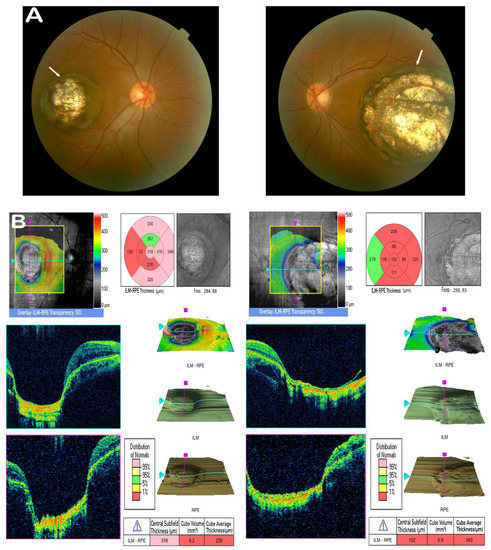 - Phillips, C.I. Hereditary macular coloboma. J. Med. Genet. 1970, 7, 224–226. [Google Scholar] [CrossRef][Green Version]