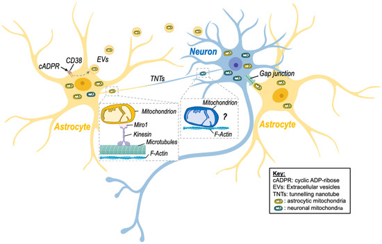 Intercellular mitochondrial transfer between neurons and astrocytes. Evidence of mitochondrial transfer between neurons and astrocytes has been described, and different processes have been highlighted. Namely, activation of CD38 (cluster of differentiation 38) by cyclic ADP-ribose (cADPR) induced the release of extracellular vesicles (EVs)-containing mitochondria by astrocytes in a model of stroke, improving neuronal viability. Transfer of mitochondria via tunnelling nanotubes (TNTs) has also been shown. This mode of transfer seems to rely on components of the cytoskeleton (microtubules and F-actin) as well as on the mitochondrial Rho-GTPase-1 protein (Miro-1) and its connection with kinesin for mitochondrial transport. Although transfer of neuronal mitochondria via TNTs is depicted on the figure, there is no clear evidence that mitochondria can be transferred from neurons to astrocytes via this route. Transfer of mitochondria between neuronal cells might involve microtubule-independent mechanism that remain to be identified. Nevertheless, transfer of astrocytic mitochondria to neurons via TNTs has been described. Other processes involving gap junctions may also be involved but still need to be studied in more detail in the brain. Created with BioRender.com (accessed on 7 November 2022).