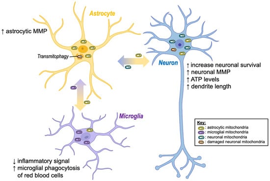 Mitochondrial dysfunction has been identified as a hallmark feature of brain injury and disease. Specifically, alterations in mitochondrial membrane potential, oxidative stress, ATP production, and mitochondrial dynamics are thought to play a causative role in the pathogenesis of neurodegenerative disorders, including Alzheimer’s disease [7,23], Parkinson’s disease [72], and multiple sclerosis [73], as well as stroke [74], traumatic brain injury [75], and neurodevelopmental disorders [76,77]. Recent evidence from animal models suggests that brain injury or disease induces mitochondrial transfer from glia to neurons and is associated with improved neurological outcomes. As a result, the mechanistic role and therapeutic potential of mitochondrial transfer in the brain has sparked widespread interest.