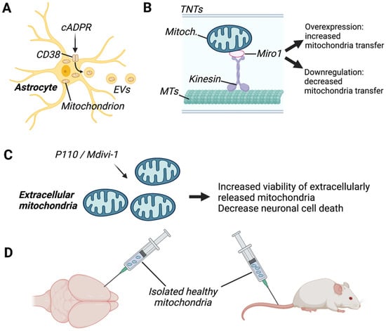 Examples of therapeutic approaches targeting mitochondrial transfer in the brain. (A) Enhancement of mitochondrial transfer via extracellular vesicles (EVs) was performed by activating astrocytic CD38 (cluster of differentiation 38) with cyclic ADP-ribose (cADPR), which improved neuronal viability in a model of stroke. (B) Enhancement of mitochondrial transfer via tunnelling nanotubes (TNTs) was done by overexpressing the mitochondrial Rho-GTPase 1 (Miro1), which increased TNT formation. (C) Inhibition of mitochondrial fusion proteins and dynamin-related protein 1/fusion 1 (DRP1/FIS1), with P110 or Mdivi1, was shown to improve the viability of extracellular mitochondria, decreasing neuronal death. (D) Therapeutic approaches consisting of intracranial or intravenous injection of healthy mitochondria in rodents revealed that transplanted mitochondria are present in brain resident cells and exerted protective effects. MTs, microtubules. Created with BioRender.com (accessed on 7 November 2022).