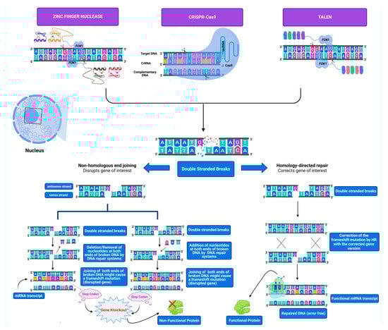 Eukaryotic genomes comprise billions of DNA nitrogenous bases. The ability to change certain DNA nitrogenous bases at accurately defined locations is crucial in molecular genetics, biotechnology, and medicine []. Genetic modifications have long been a matter of concern in molecular biology research. Nowadays, investigating the fundamental function of genes affecting human phenotypes is a big task for researchers to confront. A simple example to understand the role of a particular gene is to either overexpress or switch it off and analyze the outcomes, which are time consuming, challenging, and expensive [,]. The introduction of the genome-editing concept to the research field paved the way for functional genomics, genetically modified organisms, and regenerative medicine to evolve rapidly in this competent research field []. Following extensive attempts, researchers finally relied on a clue to manipulate the genome, which is inducing “DNA damage”. This is a life-threatening phenomenon where the most well-known detrimental type of DNA damage is the formation of double-strand breaks (DSBs). Exogenous DNA-damaging agents include ionizing radiation (IR), chemicals, pollutants, and some anti-tumor drugs. In contrast, endogenous DNA harmful agents have oxidative reactions with water where DNA is engaged, and reactive oxygen species (ROS) are the primary examples for generating DSBs, which, if unrepaired properly, might lead to genomic instability as well as the development of various types of cancer []. However, there are known “life-savers”, which are the DNA repair systems capable of fixing such breaks via one of two repair pathways: homology-directed repair (HDR) or non-homologous end joining (NHEJ). The cooperation of NHEJ and HDR repair pathways in the cell cycle occurs in a dependent manner where the NHEJ pathway is predominant in most cell cycle stages, being primarily active during the G1 phase, and as the name implies, it joins the broken ends of the double-stranded DNA without the requirement of a homologous sequence template. The HDR pathway instead requires a homologous sequence template and is predominant during the S/G2 phase where the sister chromatid is present [,,]. It has been shown that the HDR pathway is the most dominant DSBs repair pathway in yeast Saccharomyces cerevisiae over the NHEJ pathway, while the opposite is true in higher eukaryotic species [,]. Furthermore, the NHEJ repair pathway is classified as error-prone because errors mainly occur upon processing the ends of the broken double-stranded DNA by either adding or removing nucleotides, generating frameshift mutations in DNA-transcribed regions that might be either mutagenic or lethal to the cells []. Contrary to the NHEJ repair pathway, the HDR pathway is classified as error-free because the repair of the DSBs does not rely on the addition or removal of nucleotides at the broken ends of the double-stranded DNA, but on the precise incorporation of new DNA fragments in homology with the neighboring lesion sequences based on homologous recombination []. Extensive research on DNA repair systems developed the concept of targeted DSBs at specific DNA sequence regions, a secret treasure lying behind the tremendous efficacy of genome editing strategies. The three most well-known classes of nucleases utilized as genome editing tools are transcription activator-like effector nucleases (TALENs), zinc finger nucleases (ZFNs), and clustered regularly interspaced palindromic repeats (CRISPR) and its associated nucleases (Cas) []. This review article will discuss the genome-editing tools CRISPR-Cas9, ZFNs, and TALENs. It will also encompass the importance of CRISPR-Cas9 technology in generating cellular disease models for novel therapeutics, its applications in gene therapy, and challenges with possible solutions for enhanced specificity.