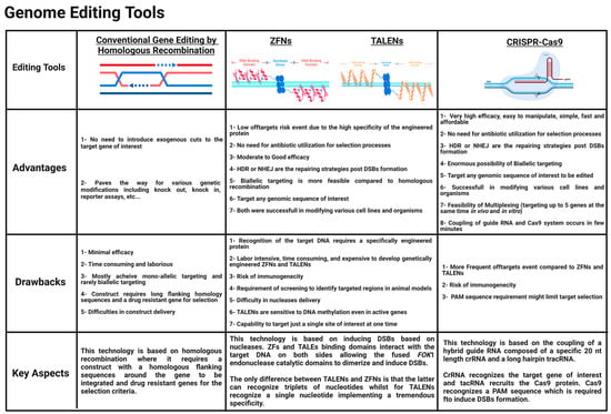 Comparison of genome editing tools. Comparison between homologous recombination (HR), ZFNs, TALENs, and CRISPR-Cas9 in terms of advantages, drawbacks, and key aspect features.