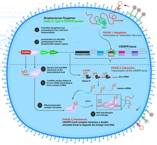 Key features of CRISPR-Cas9-based acquired immune response in Streptococcus pyogenes. Adaptation. The first step involves the recognition and cleavage of the foreign viral DNA by specific Cas proteins (Cas2 and Cas3) into smaller fragments and their incorporation into the spacer region of the bacterial genome. Expression. The second step involves the expression of the CRISPR locus to generate pre-cRNA, which is afterwards processed by specific RNases (RNase III) to generate mature crRNA. Interference. The third step involves the assembly of the mature crRNA with the tracRNA, which recruits the Cas9 endonuclease to form the CRISPR-Cas9 complex system. Taking the advantage of crRNA’s homology with the viral DNA sequence, the target viral DNA is chopped by Cas9 endonuclease to inactive the virus.