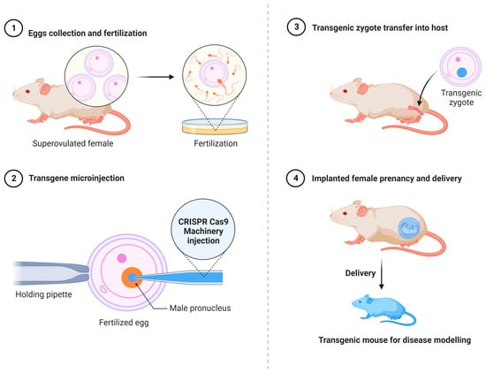 Direct injection of Cas9 mRNA and sgRNAs into single-cell mouse embryos for genome editing. The generation of transgenic mouse models can be achieved by collecting eggs from a super-ovulated female mouse followed by in vitro fertilization by the sperms of a male mouse. The fertilized egg then undergoes a direct injection of the CRISPR-Cas9 machinery. After several days, the developed transgenic zygote is reintroduced into a host female mouse to become pregnant and produce a transgenic mouse utilized for modeling the disease of interest.