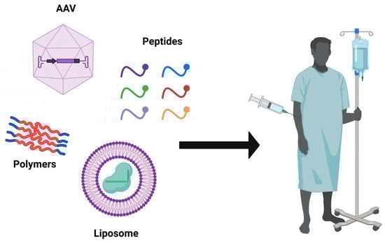 Cargo and delivery vehicles are the two main forms of delivery. Three methods are frequently mentioned when dealing with CRISPR-Cas9 cargos: (1) ribonucleoprotein complex (Cas9 protein with the single guide RNA), (2) a DNA plasmid that can express both the Cas9 protein and the single-guide RNA, and (3) Cas9 mRNA, which will be translated following delivery in the cytoplasm and afterwards will become coupled to the single-guide RNA [,]. Which of these three cargos can be packed and whether the system is useful in vitro or in vivo will frequently depend on the delivery vehicle that is being employed. Furthermore, the tight control of the optimal concentration to be considered for Cas9 and the guide RNA is necessary to prevent the risk of undesired cytotoxicity. For example, to introduce Cas9 as a DNA format, it becomes quite complicated to ascertain how many Cas9 units can be functional and perform the edit compared to the Cas9 protein. Delivery vehicles can be divided into three general categories: non-viral vectors, viral vectors, and physical vectors. The most well-known non-viral-vectors are cell-penetrating peptides, lipid nanoparticles, gold nanoparticles, and DNA nanoclews, whilst viral vectors can include lentiviruses and engineered AAVs. Electroporation and microinjection are also widely used as physical delivery approaches. It is worth adding that each approach or delivery method has its advantages and disadvantages, and parts of them can be quite specific to the type of delivery utilized. For example, the impact of delivering it to cells might be completely different from that when delivering it to a living organism. In addition, using ribonucleoprotein complex instead of mRNA or plasmid DNA will significantly decrease the unintended off-target events, which are critical for future therapeutic approaches. Moreover, the chosen delivery system must acquire two key characteristics: high specificity, which can effectively target the desired target of interest, and safety, because living organisms are always the concern and the priority. CRISPR-Cas9 should be given more attention to developing a new, robust delivery strategy [,].