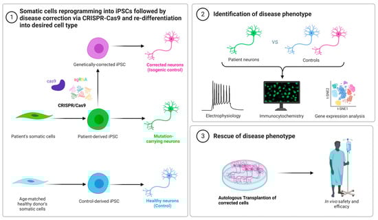 Use of patient-derived induced pluripotent stem cells (iPSCs) with CRISPR-Cas9 for pediatric neurological disorder modeling and for treatment. Patient’s somatic cells can be reprogrammed to generate iPSCs where they can be genetically modified and corrected by CRISPR-Cas9 followed by their re-differentiation into corrected neurons. Characterization of the disease phenotype can be achieved by various techniques including immunocytochemistry, electrophysiology, and gene expression analysis. These corrected neural cells can rescue the disease phenotype of the patient by undergoing autologous transplantation of corrected cells.