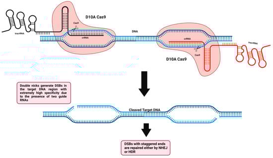 To enhance the specificity and reduce off-target events when using this technology, second-generation genome-editing tools were required. As previously mentioned, the RuvC nuclease domain cleaves the non-complementary target DNA strand and the HNH nuclease domain cleaves the complementary target DNA strand base pairing with sgRNA. Cong et al. created the first Cas9 nickase (Cas9n) by a mutation in the native Cas9 nuclease domain (RuvC-mutant D10A, aspartate to alanine substitution), which impairs the ability of Cas9 to cleave non-complementary target DNA strands, thus creating a single nick from the complementary side, which can be repaired faithfully by the mammalian cells without inducing DSBs and therefore limiting off-target scenarios (Figure 8) []. Interestingly, it is also possible to undergo another single-point mutation in HNH of native Cas9 (HNH-mutant H840A), which impairs the ability of Cas9 to cleave complementary target DNA strand, thus creating a single nick from the non-complementary side. A high-fidelity homology-directed repair method is generally used to repair individual nicks generated in the genome (HDR). To increase the specificity and reduce off-target events, Cas9n has been utilized in a pair of nickase systems with two distinct gRNAs that, when they are in close proximity and induce nicks at the same time, are capable of inducing DSBs that produce staggered ends instead of blunt ends and can be utilized for NHEJ or HDR [,,]. Using the paired-nicking approach, HDR becomes more specific than the native Cas9 approach with a sharp decrease in the off-target events by 50- to 1500-fold less without altering the on-target cleavage efficiency []. Nickases can be useful tools for prime and base editors, which have the potential to edit the DNA sequence in a precise fashion without the need to introduce double-stranded breaks or donor DNA templates, thus having no reliance on the HDR pathway. Nowadays, base editors comprise a CRISPR-Cas9 nickase (incapable of forming DSBs due to a catalytic domain impairment) linked/fused to either proteins capable of triggering DNA repair or a single-stranded DNA deaminase enzyme. Base editors can currently be classified into two major classes: adenine base editors (ABEs), which have the capacity to convert A•T base pairs to G•C base pairs, and cytosine base editors (CBEs), which have the capacity to convert C•G base pairs to T•A base pairs [,]. Nearly 30% of human disease variants may be due to the four transition mutations (G→A, A→G, T→C, and C→T) []. Both base editors (CBEs and ABEs) can revert or install transition mutations and this was feasible in various cellular models and animals harboring human genetic diseases [,,]. For increased precision, prime editing was introduced recently as an effective genome-editing technology that is capable of performing the whole 12 possible types of point mutations (insertions, deletions, and substitutions), as well as small regional insertions and deletions in a targeted and precise manner in the DNA of interest. Prime editors are composed of a CRISPR-Cas9 nickase domain linked/fused to a reverse transcriptase functional domain. This system also requires a uniquely engineered prime editing guide RNA (pegRNA), which has a spacer sequence that can guide the primer editor to the genomic DNA to be precisely edited. Furthermore, it has the designed edit of interest to be added in an extension region at the 3′ end following the nicking (single-stranded break) of the target DNA by Cas9 nickase. The prime editor acquiring the reverse transcriptase functional domain utilizes the newly released 3′ end of the target DNA region to prime/initiate reverse transcription using the extension region, which is present in the pegRNA as a template. Following reverse transcription, the newly edited DNA target site will exist as a 3′ DNA flap, which is redundant with a 5′ DNA flap having the unedited DNA sequence. Under normal conditions, DNA repair systems tend to remove the 5′ DNA flap, enhancing the incorporation of the edited 3′ DNA flap into the DNA target site, thus generating a heteroduplex DNA where one strand is edited and the other strand remains unedited. The edit is installed permanently with the help of a simple sgRNA to further direct the primer editor to induce another nick to the non-edited strand, thus allowing the DNA repair systems to faithfully use the edited strand as a template to re-synthesize the non-edited strand, thus generating a permanent edited DNA duplex. Several human cell lines [], human induced pluripotent stem cells [], mouse cortical neurons [], and mouse embryos [] were utilized for prime editing.