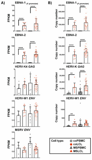Wieland, L.; Schwarz, T.; Engel, K.; Volkmer, I.; Krüger, A.; Tarabuko, A.; Junghans, J.; Kornhuber, M.E.; Hoffmann, F.; Staege, M.S.; et al. Epstein-Barr Virus-Induced Genes and Endogenous Retroviruses in Immortalized B Cells from Patients with Multiple Sclerosis. Cells 2022, 11, 3619. https://doi.org/10.3390/cells11223619