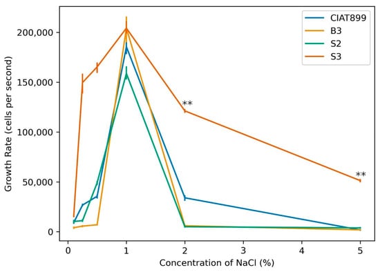 Growth response of rhizobia isolates B3, S2, and S3 in media with different NaCl concentrations in comparison to the commercial strain CIAT899 (one-way ANOVA; ** indicates p ≤ 0.001).