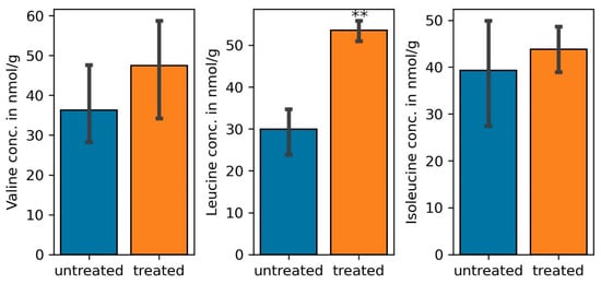 Quantity of branched chain amino acids, valine, leucine, and isoleucine in common bean nodules treated with 300 mM NaCl (treated) compared to those not treated with the salt (untreated). (one-way ANOVA; ** indicates p ≤ 0.001).