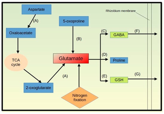 A schematic flow showing glutamate metabolic pathways in bacteroids under salinity stress. The letters represent the enzymes (A) aspartate amino transferase (K14454, COG0075), (B) 5-oxoprolinase (K01469), (C) glutamate decarboxylase 1 (K01580), (D) gamma-glutamyl phosphate reductase (COG0014), (E) glutathione synthase (K01920), (F) branched-chain amino acid transport system substrate-binding protein (K01999), and (G) glutathione transport system substrate-binding protein (K13889). This figure was drawn in Libre Office Draw.