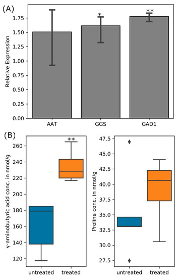 (A) Transcript abundance for nodule bacteroids’ aspartate aminotransferase (AAT), glutathione synthase (GGS), and glutamate decarboxylase (GAD1) when infected plants were treated 300 mM NaCl relative to untreated nodules and (B) quantity of GABA and proline in the nodules of treated and untreated (control) plants. (one-way ANOVA; * indicates p ≤ 0.05 while ** indicates p ≤ 0.001).