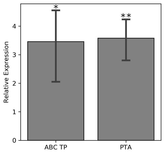Relative expression levels of the genes for the ABC transporter permease and K+ transporter ATPase (COG2060) in the nodules of common beans with qPCR after treatment with 300 mM NaCl treated and untreated (control) plants. (one-way ANOVA; * indicates p ≤ 0.05 while ** indicates p ≤ 0.001).