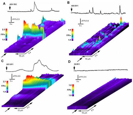 In Figure 2A, the top trace depicts the Ca2+-fluorescent signal evoked in response to intracellular injection of 10 nl of AD3-TEC sample at the time indicated by the arrow in the line-scan. Below is the corresponding line-scan (kymograph) image, showing temporal evolution of the fluorescent signal originated by measuring changes in fluorescence intensity along a single line scan (25 μm long and 5μm wide) properly positioned above the centroid of the fluorescent signal. The panel displays the signal evolution over time as a pseudo-colored representation where warmer colors indicate increase in fluorescence ratio intensities. Fluorescent transients with different amplitudes and duration are evident along the line-scan, reminiscent of the hierarchical organization of IP3-mediated Ca2+ signaling. Figure 2B,C illustrate the corresponding fluorescent response to injection of AD3-B11 and AD1-B11 samples showing large variability in time and amplitudes of the fluorescent responses. This variability was shared among all the tested AD-affected samples, independently from the donor or brain region (B11 or TEC). Figure 2D shows a typical response obtained after intracellular injection of a 10 nl sample from normal brain, representative of 12 trials which consistently failed to give detectable fluorescent responses.