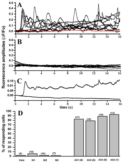 A great deal of progress has been made in recent years to better understand the involvement of Aβ in the progression of Alzheimer’s disease [25,26,27]. A widely accepted hypothesis implicates the oligomeric forms of Aβ as the main toxic agent triggering an uncontrolled elevation of cytosolic Ca2+ to a poisonous level, with consequent impairment of normal cellular functioning and final death [1,2,7,14,28]. Using Ca2+-dependent fluorescent imaging we had previously proposed two distinct mechanisms by which Aβ42 affects intracellular Ca2+ homeostasis. One, by forming self-gating Ca2+-permeable pores allowing uncontrolled influx of extracellular Ca2+ into the cytosol; and a second mechanism involving the release of Ca2+ from intracellular stores through the opening of IP3R channels [7,8]. These two mechanisms have been widely investigated by various groups using many different approaches [29,30,31,32,33]. Nevertheless, most of these investigations have been carried out using synthetic Aβ peptides, leading to ambiguity as to whether the proposed mechanisms of action are also applicable to endogenous Aβ oligomers found in neurons of AD-affected brains [34]. Here, we report the ability of brain extract samples displaying a high content of Aβ oligomers to evoke cytosolic Ca2+ release upon intracellular injection, closely mirroring the effect of synthetic Aβ42 oligomers in analogous experiments. The samples consist of homogenate extracts from postmortem brain tissues from frontal cortex of donors with clinical and pathological details shown in Table 1. Three samples from the frontal cortex (B11) of normal individual were used as control and compared with four samples (three B11 and one TEC) from three individuals exhibiting the typical hallmarks of AD-affected brains (Table 1). The immunological characterization shown in Figure 1A reports dot blot analysis of samples probed with conformation-specific OC and A11 antibodies and sequence-specific 6E10 and 4G8 antibodies [35,36,37,38,39]. All the samples we tested displayed low immunoreactivity to A11, 6E10, and 4G8, whereas high immunoreactivity was detected for OC antiserum (Figure 1B). Quantitative analysis of the dot blot data show significant levels of OC immunoreactivity in the AD samples compared to normal subjects. Particularly, AD3 samples for both B11 and TEC regions displayed a higher content of OC-positive Aβ oligomers. Moreover, AD3 brains showed increased plaque stage as compared to AD1 and AD2 (Table 1). Intriguingly, all the AD samples displayed low immunoreactivity to A11, indicating that the endogenous Aβ oligomers contained in the brain samples had a specific fibrillar oligomer aggregation state, equivalent to that acquired by the synthetic Aβ42 oligomers in our previous preparations [8].