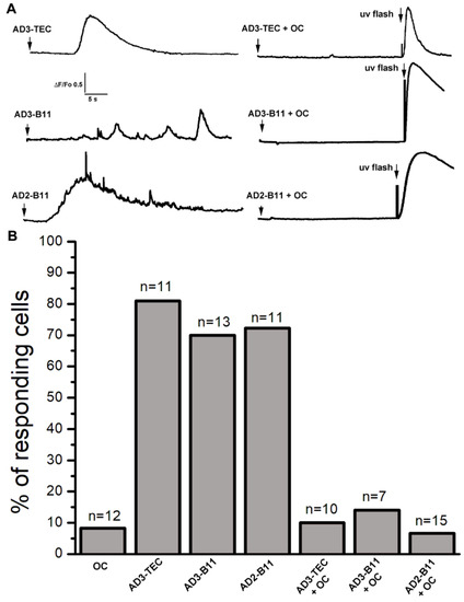 We then performed parallel experiment using the corresponding sample which had been previously incubated with OC antiserum. Top-right trace in Figure 4A depicts the averaged intensity of the fluorescent signal recorded after injection of 10nl of AD3-TEC+OC. The sample was injected at the time indicated by the arrow and with ~30 s delay a pulse of UV was applied as to confirm functional capability of the IP3 signaling system. Similar experiments for samples AD3-B11 and AD2-B11 are reported in the middle two traces and bottom two traces of Figure 4A, respectively. The cumulative results of this set of experiments are reported in Figure 4B. Each column in the plot represents the number of responding cells as percentage of the total cell tested as indicated on top of each column.