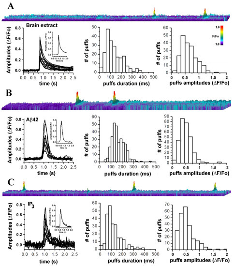 Figure 5B shows analysis of fluorescent events evoked by intracellular injection of 10 nl of synthetic Aβ42 oligomers (1 μg/ml). Top image illustrates repetitive puffs occurring at the same location in the image field. Below, the left plot is generated by the overlapping traces from 10 selected puffs. The trace in the inset is generated averaging the 10 traces in main plot. Center and right plots are the distribution of the measured puff durations and amplitudes. Figure 5C illustrates comparative analyses of the fluorescent transients generated directly by intracellular injection of 10 nl of IP3 (10 nM).
