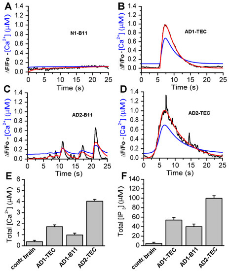 Computational analyses of the fluorescence signals allows quantification of Ca2+ released and the corresponding IP3 generated by each brain extract. In Panels (A,B), the black trace is ΔF/Fo (experiment), red is ΔF/Fo (model), and blue is the estimated Ca2+ from the model. (C,D), are sample traces from control brain, AD3-TEC, AD3-B11, and AD2-B11. The bar plots in (E,F) show the total concentration of Ca2+ released and IP3 generated by brain extracts in 20 s, both estimated from the model fits. The error bars represent standard deviation from three experiments.