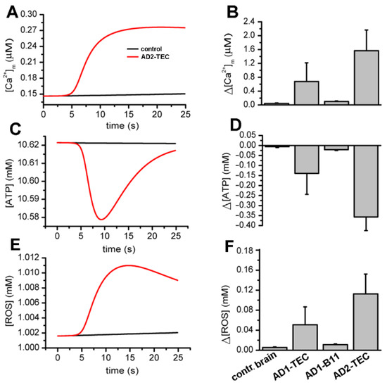 Next, we used our model to estimate the bioenergetic cost of the aberrant Ca2+ rises due to brain extracts. Specifically, we feed the Ca2+ traces estimated above to a model for mitochondrial bioenergetics to estimate the changes in mitochondrial Ca2+ concentration, cell’s ATP, and ROS levels as detailed in the Section 2. Sample traces for these three variables in cells injected with control and AD2-B11 extracts are shown in Figure 8A,C,E, respectively.