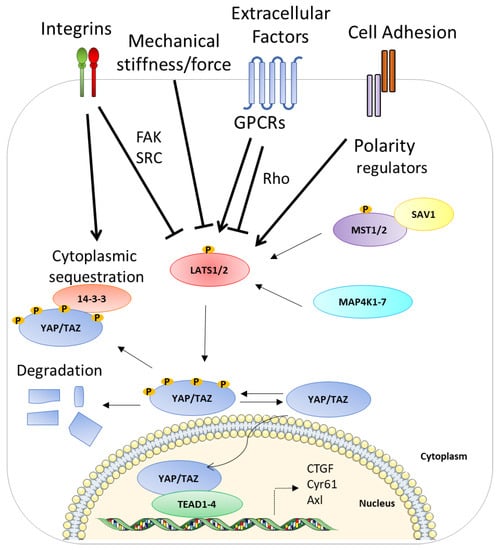 - Piccolo, S.; Dupont, S.; Cordenonsi, M. The Biology of YAP/TAZ: Hippo Signaling and Beyond. Physiol. Rev. 2014, 94, 1287–1312. [Google Scholar] [CrossRef]