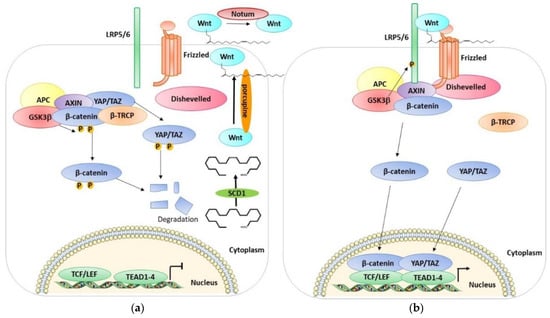A schematic representation of the OFF and ON state of the Wnt pathway. (a) A scheme of the Wnt OFF state. The lack of Wnt ligands leads to the degradation of β-catenin, YAP/TAZ. Consequently, the level of β-catenin and YAP/TAZ in the cytoplasm is low, and they cannot enter the nucleus and activate their target genes. (b) A scheme of the Wnt ON state. Wnt ligands interacting with Frizzled inhibit the degradation of β-catenin and YAP/TAZ which accumulates in the cytoplasm and can enter the nucleus and interact with TCF/LEF and activate Wnt-responsive genes. See text for details.