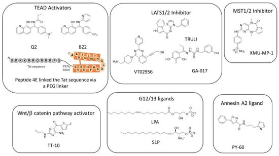 A cell-based, high-throughput screening developed for the identification of small molecules that promote cell proliferation (particularly in 3D conditions) led to GA-017 (Figure 4), a LATS kinase inhibitor that presents in vitro IC50 of 4.1 nM (LATS1; 400 µM ATP) and 3.9 nM (LATS2; 400 µM ATP) []. This compound promotes the formation of SKOV3 (ovarian adenocarcinoma) and A431 (squamous carcinoma) spheroids and mouse intestinal organoids by inducing YAP nuclear localization that induces significant increases in Ankrd1, Cyr61, and CTGF expressions at 5–20 µM. Using a similar approach on HEK293A-TEAD-luc cells, Shalhout et al. reported the activation of the YAP–TEAD interaction of PY-60 (Figure 4), a compound that liberates Annexin A2 from the membrane and in turn inhibits YAP phosphorylation []. The authors reported a micromolar affinity for Annexin A2 as measured by biolayer inferometry and the activation of YAP–TEAD target genes (Ankrd1, CTGF, and in less intensity, Cyr61) at 1–10 µM. This study revealed Annexin A2 as a new druggable component of the Hippo pathway that added complexity to the Hippo pathway.