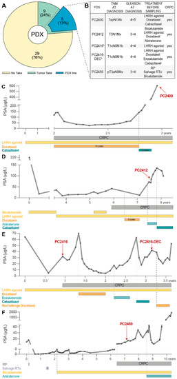 Development of CRPC PDXs. (A) Pie chart of PCa samples subcutaneously implanted in intact male nude mice to generate PDXs. No take (yellow) indicates absence of tumor outgrowth during a monitoring period of six months. Tumors take (green) represents successful engraftment followed by one to two mouse passages. PDX line (blue) indicates established PDXs through continuous mouse-to-mouse propagation. (B) Clinical and pathological patient characteristics for established PDXs. Treatment history prior to sampling is provided, including local treatments (radical prostatectomy (RP) and radiation therapy (RTx)), and systemic treatments (luteinizing hormone-releasing hormone (LHRH) agonists, chemotherapy, and AR signaling inhibitors). * Indicates identical patient origin. (C–F) Treatment timelines of the patients that gave rise to PC2400 (C), PC2412 (D), PC2416 and PC2416-DEC (E), and PC2459 (F) PDXs, depicted as PSA response from time of diagnosis (day 0) to death. Time point of tissue sampling for PDX engraftment is indicated by a red arrow.
