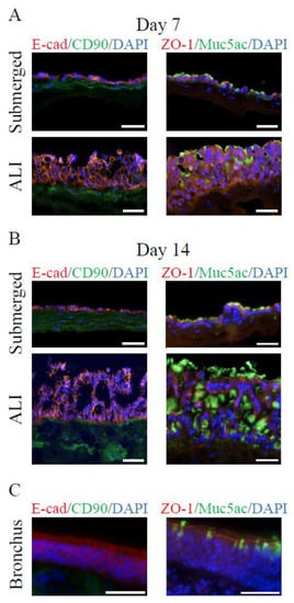 In addition, alcian blue staining demonstrated that ALI models developed mucus-producing cells after 7 days of culture, which was more prominent after 14 days and further increased after 21 and 28 days of ALI cultivation (Figure 1B and Figure S1). The thickness of the mucus layer was estimated histologically using the alcian blue staining (Figure 7E). This staining method indicated an increase in the thickness of the mucus layer with the proceeding age of the 3D ALI model. Comparable with the submerged models, hpF migrated into the collagen scaffold. 3D ALI models at day 7 resembled most of the anatomy of the native bronchial epithelium with mucus present apically (Figure 1C). The airway epithelium is characterized by the expression of markers specific to the different cell types. To further characterize our 3D airway tissue models, immunostainings were performed against an epithelial cell marker present in adherens junctions (E-cadherin), a fibroblast marker (CD90), a tight junction marker (zonula occludens-1 (ZO-1)), and a bronchial specific mucus protein (Muc5AC) produced by goblet cells. In submerged models, Calu-3 cells showed positive immunostaining against E-cadherin at day 7 and day 14 (Figure 2A,B, left) within the monolayer. This suggested that adherens junctions were formed. The bronchial epithelial layer further established tight junctions within 7 days of cultivation (Figure 2A, right), which were maintained in 14 day old 3D submerged models (Figure 2B, right), as confirmed by ZO-1 immunostaining. Next, at day 7 and day 14, a small amount of the bronchial specific mucus protein, Muc5AC, was detected on top of the epithelial layer (Figure 2A,B, right). In ALI models, E-cadherin was found in the entire multilayered epithelium at both stages (Figure 2A,B, left). This was comparable with bronchial epithelial tissue (Figure 2C, left). ZO-1 was found abundantly in Calu-3 cells at day 7 (Figure 2A, right). In 14 day old ALI models, ZO-1 was localized more apically (Figure 2B, right), which was similar to native bronchial epithelial tissue (Figure 2C, right). The presence of the tight junction protein ZO-1 in the 3D tissue models suggested the formation of a functional epithelial barrier. In contrast to the submerged model, in ALI models, the mucus protein Muc5AC was more abundant and the amount increased considerably from day 7 to day 14 (Figure 2A,B, right). In the bronchial epithelium, Muc5AC producing goblet cells could be clearly identified (Figure 2C, right). CD90-positive fibroblasts were present within the collagen matrix in submerged and ALI models (Figure 2A,B, left). In the native bronchial epithelium, a subset of the subepithelial mesenchymal cells was CD90-positive (Figure 2C, left).