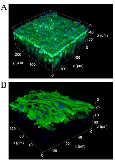 Due to the thickness of the 3D model and the density of the collagen scaffold, two-photon and confocal microscopy were performed for anatomical characterization of the model (Figure 3). Both techniques allow imaging of intact living 3D airway tissue models. Calcein-AM and Hoechst 33342 staining were used to define the cell shape and to stain the nuclei, respectively. With two-photon microscopy (Figure 3A), a tissue penetration of 120 µm was reached whereas confocal microscopy allowed for scanning up to 70 µm in depth (Figure 3B). Volume reconstruction of two-photon images illustrated a tightly formed epithelial layer that had a rippled surface (Figure 3A). To visualize fibroblasts more properly, the 3D models were scanned upside down. Confocal microscopy showed that hpF migrated into the collagen scaffold and formed a complex network (Figure 3B).