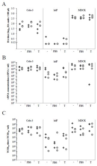 Next, we measured the concentration of infectious units via the tissue culture infectious dose 50 (TCID50) assay (Figure 4C). In general, the same trend as for HA and RT-qPCR data was found, i.e., IAV infection of MDCK cells showed slightly higher TCID50/mL values than Calu-3 cells followed by hpF (Table S3). Infections of Calu-3 cells with the NS1-RFP or A/PR/8/34 IAV resulted in similar TCID50/mL values for the respective culture conditions. For the FBS-treated cell cultures, slightly lower TCID50/mL values were measured for infection with NS1-RFP IAV.
