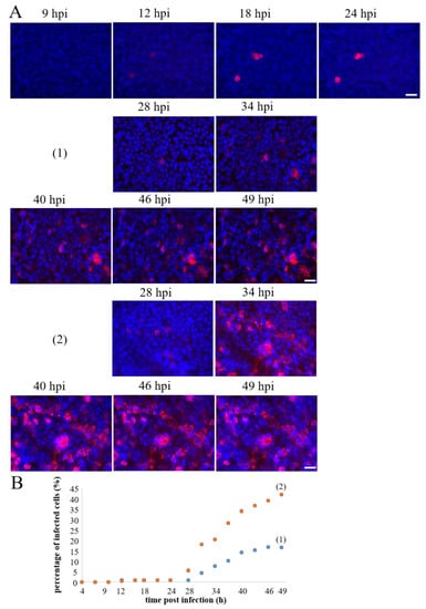 Real-time fluorescence imaging of NS1-RFP IAV infection in 3D submerged models using an MOI of 0.01. (A) Representative examples of time-lapse sequences were recorded between 9 to 24 hpi and 28 to 49 hpi, respectively. These models were pre-cultivated for 18 days and showed the first NS1-RFP fluorescence between 9 and 12 hpi. From 28 hpi onwards, the percentage of NS1-RFP-positive cells gradually increased (example (1) and (2)). (B) Quantification of the percentage of infected cells of these positions was between 4 and 49 hpi. The percentage of NS1-RFP-positive cells was calculated by cell counting of the total cell number (Hoechst-positive nuclei) and the NS1-RFP-positive cells in the respective images. Scale bars represent 25 µm.