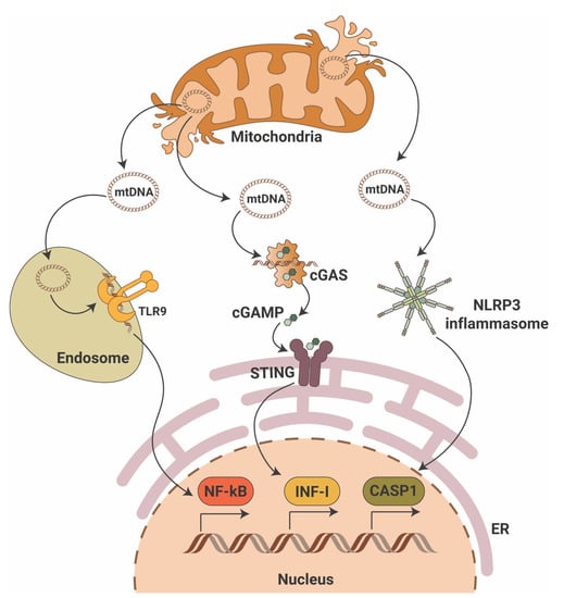 The inflammasome comprises a class of signalosomes in innate immunity that promote inflammation and induce an inflammatory form of programmed cell death, called pyroptosis. Early studies have shown that cytosolic mtDNA can also drive the activation of inflammasomes [44], specifically of the inflammasome that contains nucleotide-binding domain-like receptor (NLR) family pyrin domain-containing 3 (NLRP3) as a sensing component (Figure 1). NLRP3 assembles the inflammasome through oligomerization with apoptosis-associated speck-like protein (ASC) to elicit robust caspase 1 (CASP1) activation and production of interleukins 1β (IL-1β) and 18 (IL-18). Oxidized mtDNA release into the cytosol upon mitochondrial dysfunction has been shown to activate the NLRP3 inflammasome [45], and a feedforward loop was identified in which inflammasome activation facilitates mtDNA release via mtROS production [46]. Besides the mtROS-associated NLRP3-ASC-driven mtDNA escape into the cytosol, a physical interaction between NLRP3 and thioredoxin-interacting protein (TXNIP), a nuclear protein that controls the cellular redox state, may induce mitochondrial damage and mtDNA leakage [47]. However, ROS inhibitors seem to disrupt inflammasome priming, i.e., the synthesis of inflammasome components, but not its activation [48]. In line with this notion, recent studies showed that NLRP3 inflammasome activation depends on the mitochondrial electron transport chain [49], and that cytosolic oxidized mtDNA serves as the ultimate NLRP3 ligand [50]. Of note, mitochondrial damage per se does not trigger NLRP3 signaling if priming is omitted (reviewed in [51]). Moreover, NLRP3 inflammasome activation fails under conditions of TFAM deficiency [50]. However, mtDNA has been shown to also activate inflammasomes that use the absence of melanoma 2 (AIM2) as a sensing component [52]. Interestingly, while oxidized DNA seems to activate NLRP3 inflammasomes [45], AIM2-containing counterparts are suggested to recognize non-oxidized DNA [50].