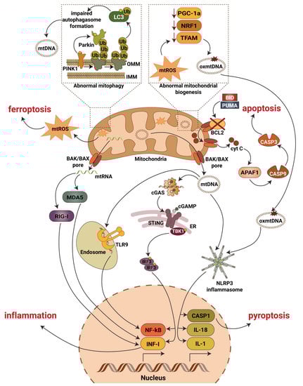 Mitochondrial contribution to DKD associated kidney damage. Generation of mitochondrial reactive oxygen species (mtROS), escape of mitochondrial RNA (mtRNA) and mitochondrial DNA (mtDNA) into cytosol, production of oxidized mitochondrial DNA (oxmtDNA) and abnormalities in mitophagy lead to activation of major pro-inflammatory signaling pathways, pyroptotic, apoptotic and ferroptotic cell death. Abbreviations: APAF1—apoptotic pepdidase activating factor 1; BAK—Bcl2 homologous antagonist/killer; BAX—Bcl2-associated X protein; BCL2—B-cell lymphoma 2; BID—BH3 interacting-domain death agonist; CASP1—caspase 1; CASP3—caspase 3; CASP9—caspase 9; cGAS—cyclic GMP-AMP synthase; cGAMP—2′3′-cyclic GMP-AMP; Cyt C—cytochrome c; ER—endoplasmic reticulum; IL-1—interleukin 1; IL-18—interleukin 18; IMM—inner mitochondrial membrane; INF-I—interferon type I; IRF3—interferon regulatory factor 3; LC3—microtubule-associated protein 1A/1B-light chain 3; MDA5—melanoma differentiation-associated protein 5; NF-kB—activation of nuclear factor κB; NLRP3—NLR family pyrin domain containing 3; NRF1—nuclear respiratory factor 1; OMM—outer mitochondrial membrane; PGC-1a—peroxisome proliferator-activated receptor-γ coactivator-1α1; PINK1—PTEN induced kinase 1; PUMA—p53 upregulated modulator of apoptosis; RIG-I—retinoic acid-inducible gene I; STING—stimulator of interferon gene; TBK1—TANK binding kinase 1; TFAM—mitochondrial transcription factor A; TLR9—toll-like receptor 9; Ub—ubiquitin.