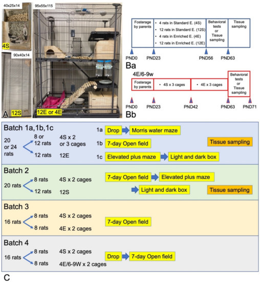 Rearing cages for LHRs and experimental protocols. (A) Rearing conditions. LHRs were reared in one of four conditions, namely, 4S, 12S, 12E, and 4E. Under 4S, 4 LHRs were kept in a standard cage measuring 40 × 25 × 14 cm [width × depth × height]; 12S, 12 LHRs were kept in a large flat cage (90 × 40 ×14 cm); and 12E or 4E, 12 or 4 LHRs were kept in a large, tall cage (95 × 55 × 115 cm) with four stages, a running wheel, three wooden pens, and other features. (B) Rearing schedule. LHR pups were reared with their parents until PND23 and then kept in each rearing condition up to PND63 (Ba). (Bb) The pups of 4E/6-9w group were kept in a standard cage until PND42 and then reared in a large, tall cage until PND71. During the behavioral test days, the rats were kept in the same cages. (C) Four kinds of Batches of rats were prepared, reared, and subjected to behavioral tests. Two groups were formed in each batch by bisecting male littermates born from the same parents.