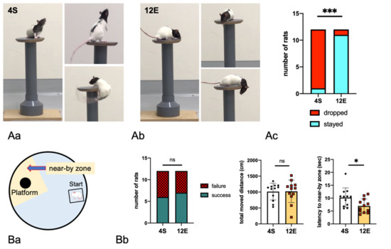 To evaluate the effects of rearing conditions on LHRs’ behaviors, various behavioral tests were carried out as described in Figure 1. First, a drop test was conducted to evaluate ADHD-like behaviors of Batch 1a rats (Figure 2A). In the control group (4S), 11 of the 12 rats moved restlessly on the disk and fell backward, whereas in the 12E group, most of the rats did not move actively, as if huddled on the disk, and only 1 of the 12 rats fell. When dropped from the disk, all the rats fell backward (Figure 2Aa), suggesting that the drop was due to their inattention and hyperactivity, rather than impulsivity. On the other hand, as shown in Figure 2Ab, the 12E rats moved very carefully, although many of them curiously looked down at the floor.