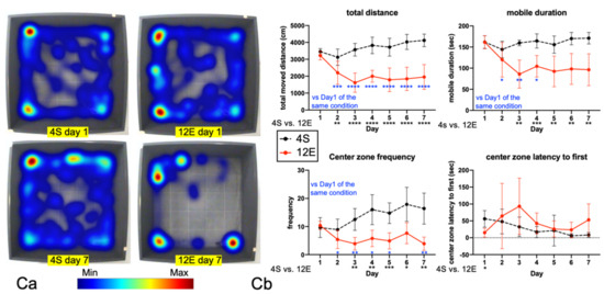 12E and 4S groups of Batch 1b, eight animals from each group were randomly selected for behavioral tests, whereas the remaining four were subjected to biochemical analysis. OF tests were conducted for 7 consecutive days (Figure 2C). On the first day, total distance traveled, duration of activity, and number of center zone entries were not significantly different between the two groups. However, the latency to the first entry into the center zone significantly differed between them: it was shorter in the 12E group than in the 4S group. From the second day onward, total distance traveled, duration of movement, and number of center zone entries decreased in the 12E group compared with the 4S group. The 4S group showed a hardly habituated response and continued hyperactivity.